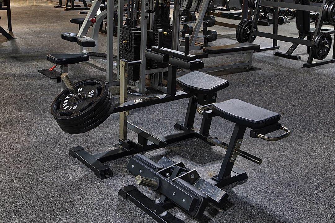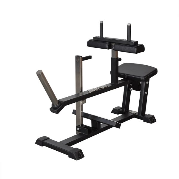This is a seated gym machine in plate loaded model. It’s designed with full isolation of the calf muscles and is easy to get into due to its open design. Set the thigh cushions to desired height with a simple pin setting. Sit down and use the handle in front of you to push the leg support up for easy entry. Place your knees under the cushions and your feet on the knurled foot support in steel. Grab the smaller handles in front of you for support and push your legs upwards.